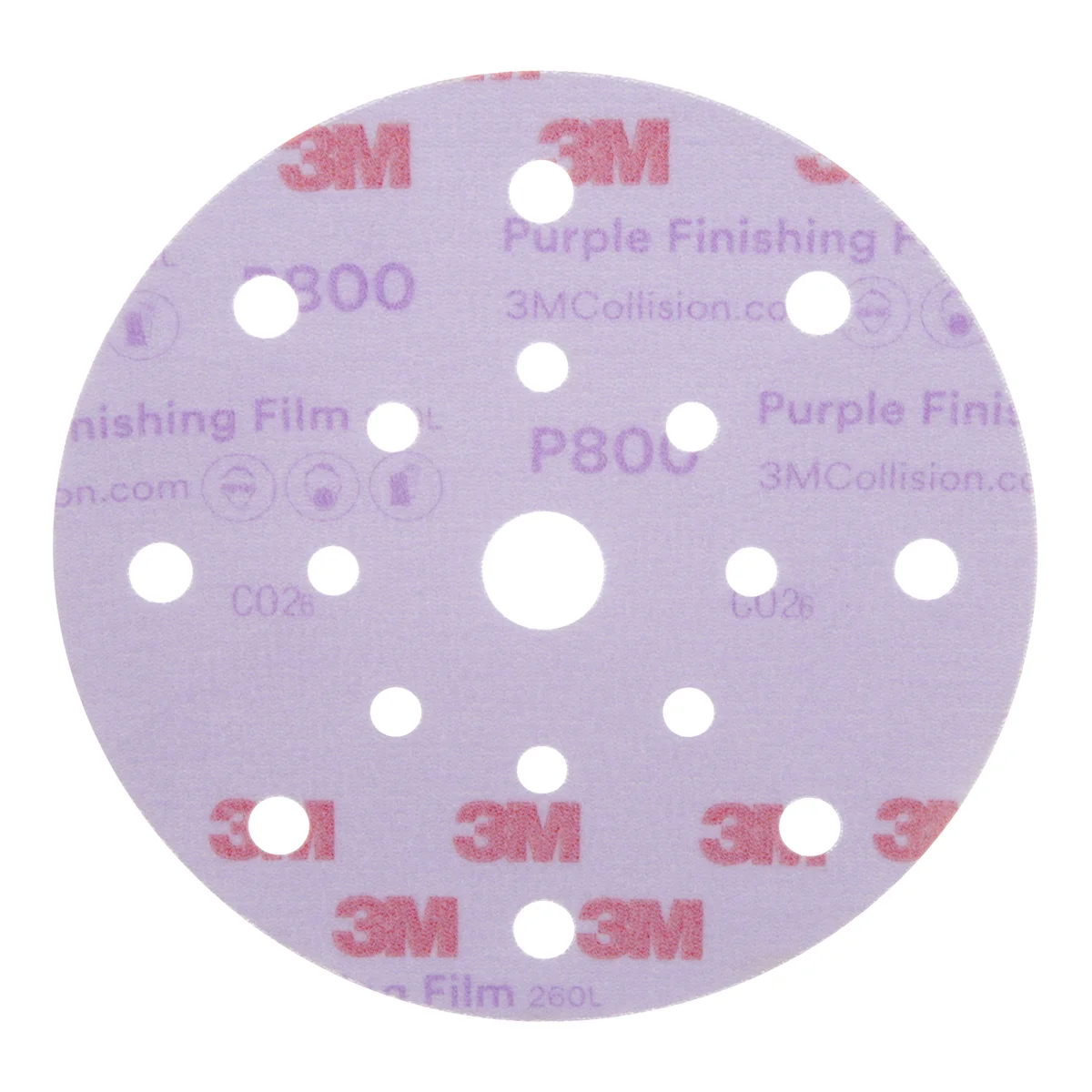 The 3M™ Hookit™ Purple Finishing Film Abrasive Disc 260L features an updated coating that levels surface defects on clear coat and greatly reduces pigtails. Aluminum oxide abrasive cuts fast, lasts a long time, resists loading with or without hole pattern designs and leaves a consistent, easy-to-polish finish. The 3M™ Hookit™ attachment system makes disc change-outs fast and easy.