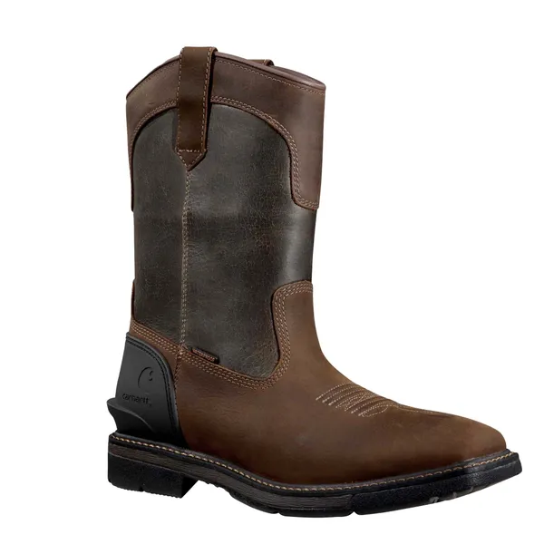 CARHARTT Men's Montana 11" Waterproof Steel Square Toe Wellington,Brown oil leather with dark green leather shaft,Steel toe meets or exceeds ASTM 2413-24 standards. Slip Resistance meets or exceeds ASTM F3445-24 standard.