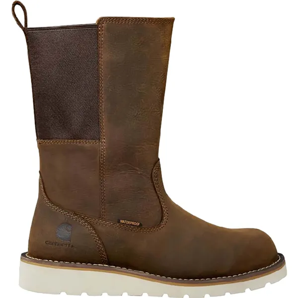 CARHARTT Women's 10" Waterproof Steel Toe Wellington Wedge Boot,Brown oil tanned leather and stretch neoprene,Steel toe meets or exceeds ASTM 2413-24 standards. Slip Resistance meets or exceeds ASTM F3445-24 standard.